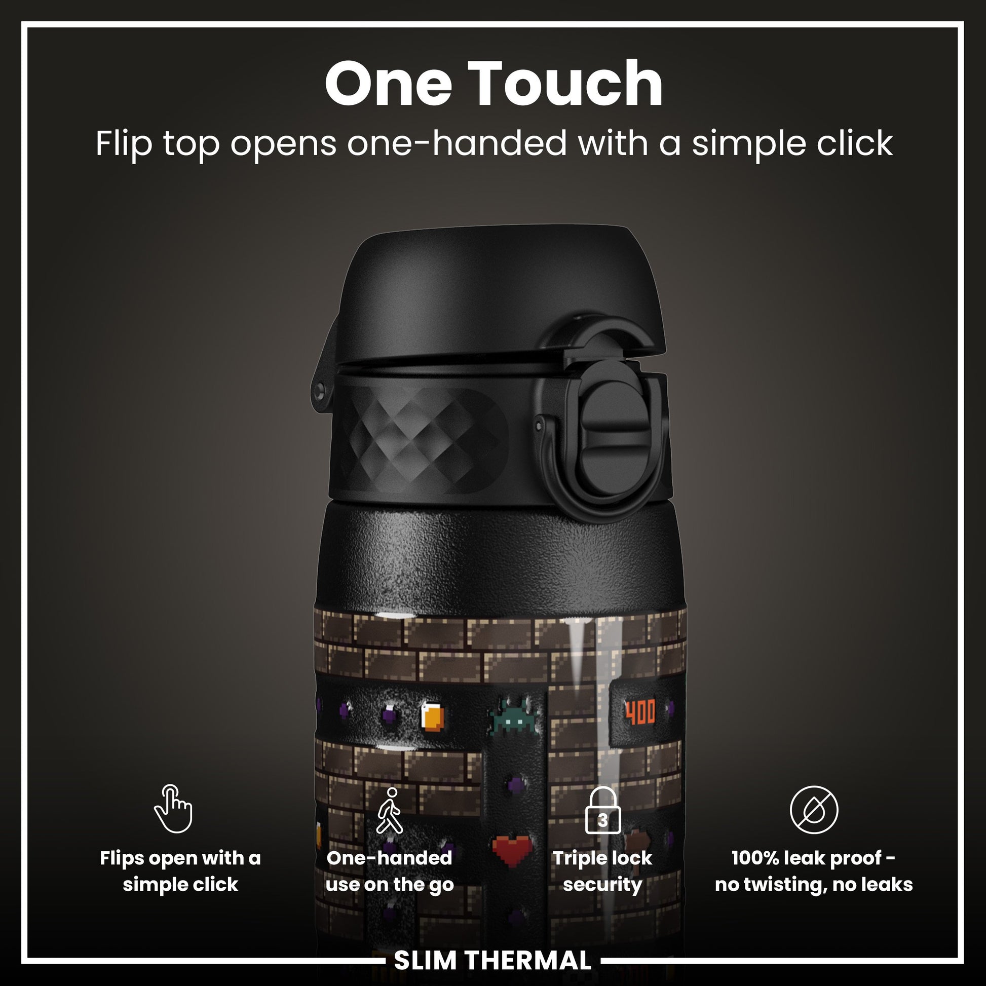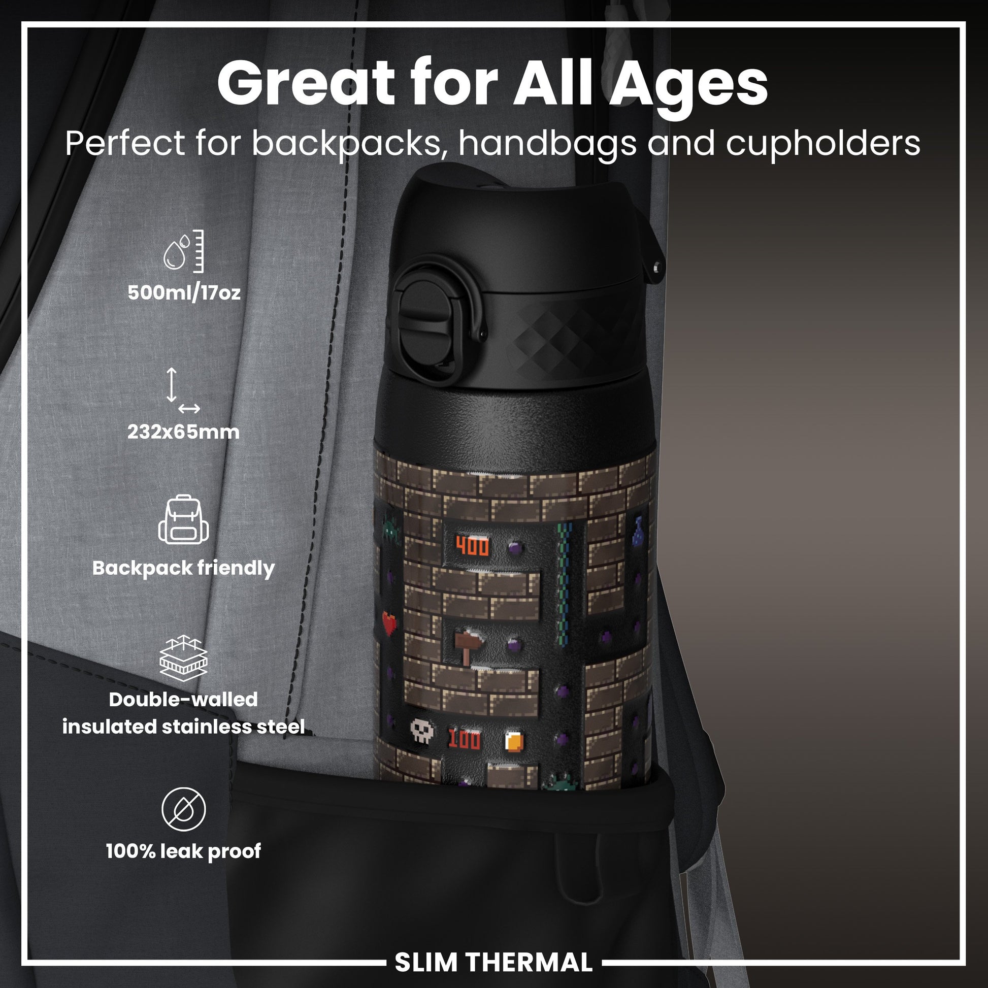 100% leak proof 500ml / 17oz vacuum insulated double wall stainless steel black water bottle with a smooth flow for spill-free hydration and hygienic flip top cover for one handed use on-the-go. Keeps hot drinks hot and cold drinks icy cold and fresh for hours.