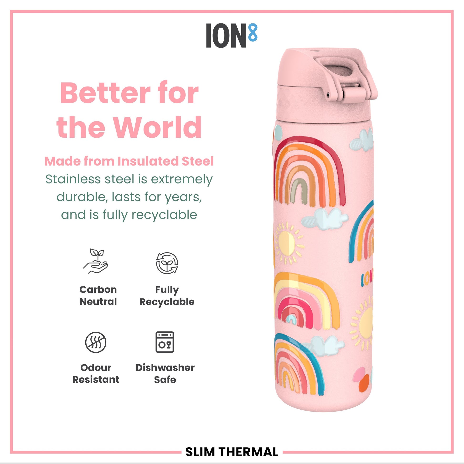 Made from vacuum insulated pro grade ThermoShield stainless steel. Stainless steel is extremely durable, lasts for years, and is carbon neutral and fully recyclable. This refillable and reusable drinks bottle is food safe, odour resistant, easy to hand wash, protects temperature for hours and keeps drinks fresh and full of flavour.