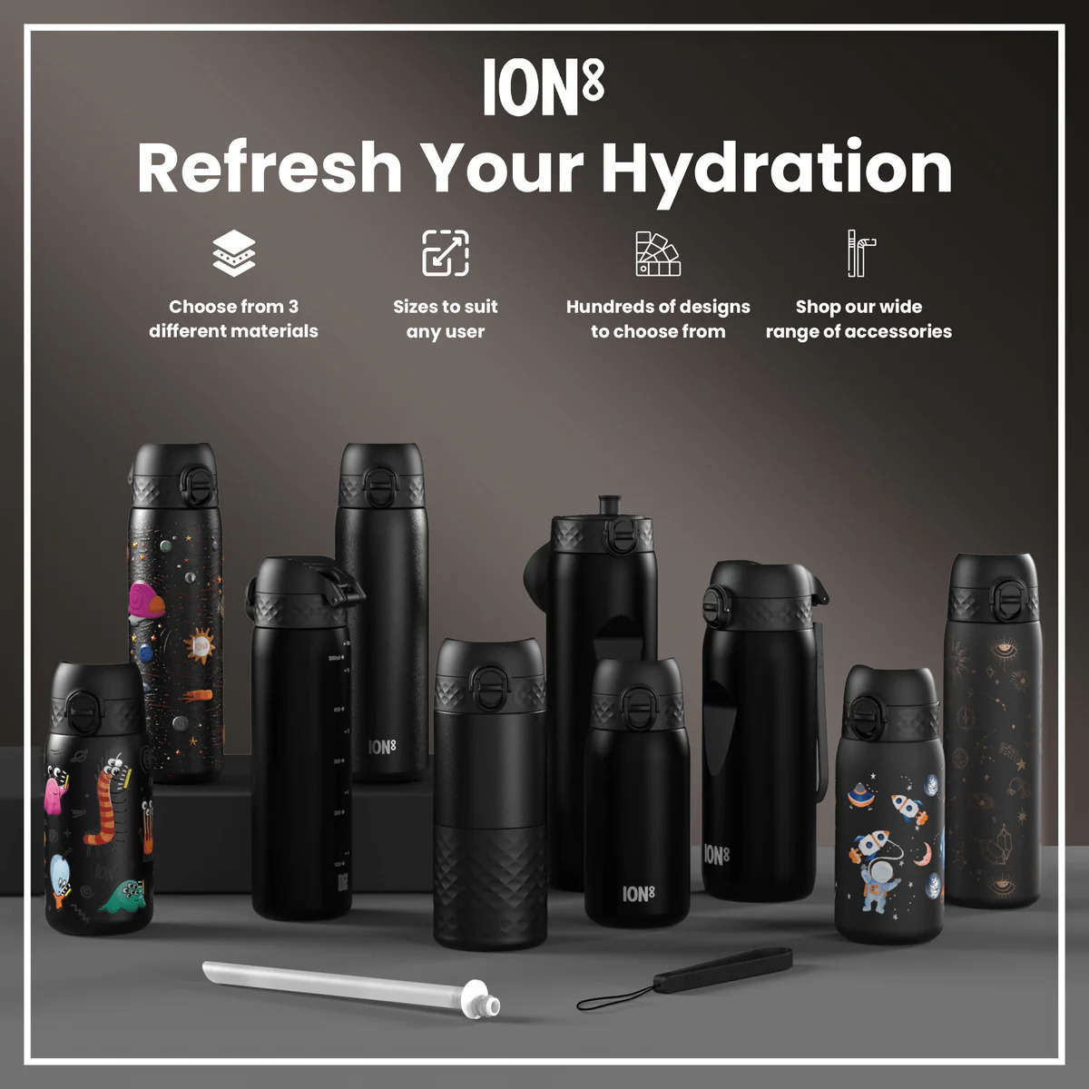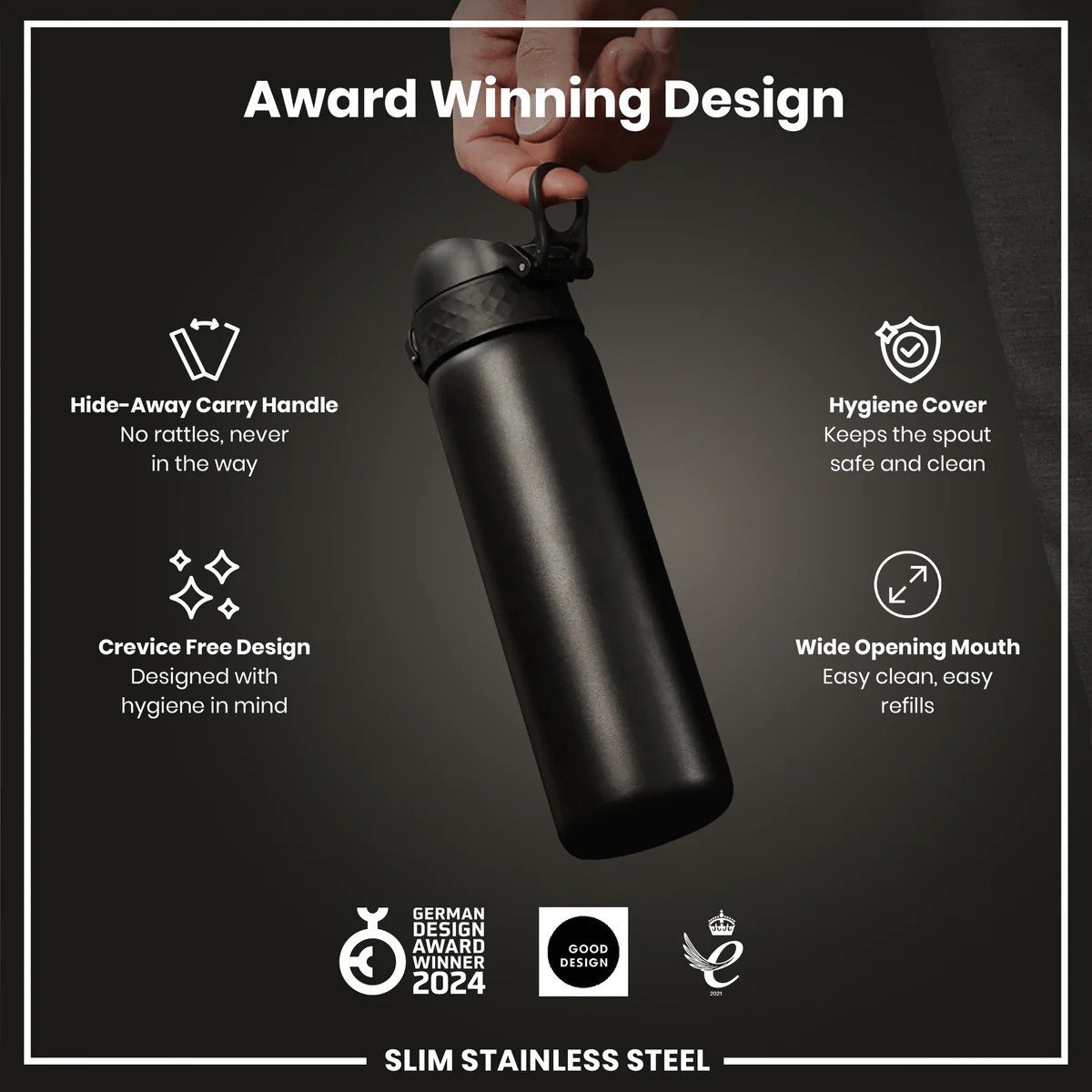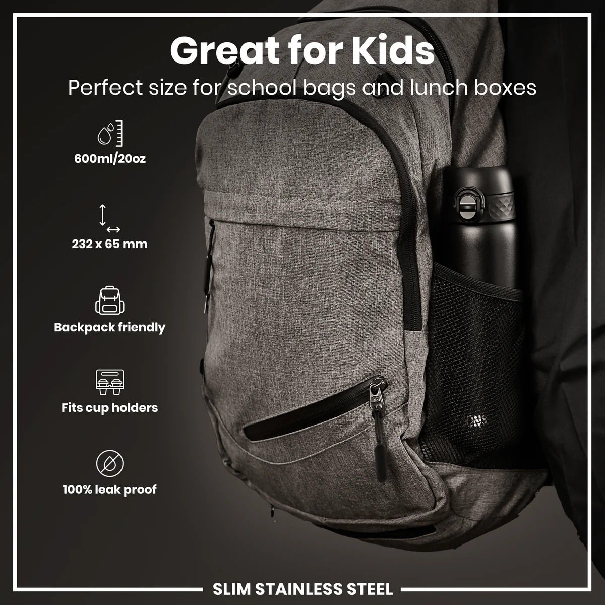 100% leak proof 600ml / 20oz stainless steel black water bottles with a smooth flow for spill-free hydration and hygienic full-flip top cover for one handed use on-the-go.